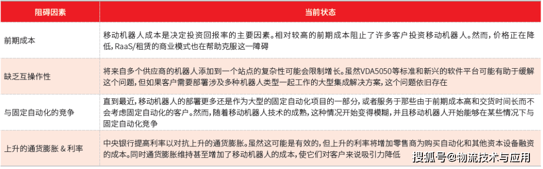 我们现正在预测,客户对挪动机械人的接管度将继续以线性增加而非指数增加的速度推进。虽然劳动力成本还正在不竭上升,但因为价钱的下降速度将低于之前的预期,两个要素的叠加正在必然程度上了挪动机械人需求的迸发式增加。同时,跟着消费者逐步回归到2020年前的采办习惯,导致所谓的“后疫情时代”调整期耽误,叠加高通缩和高利率,这些城市进一步影响消费者收入。企业仍正在推进从动化打算,以应对劳动力欠缺、工资上涨和经济不确定性等风险,确保营业的持续性和韧性。正在如许一种趋向的鞭策下,我们看到,一方面挪动机械人的采购规模越来越大;另一方面,相关的评估、审核和内部决策时间却也越来越久,耽误了发卖周期。所以,对于机械人供应商来说,这是一把双刃剑,既带来必然的波动,也包含着庞大的潜力。IA估计,2024年挪动机械人全球市场营收约55亿美元。